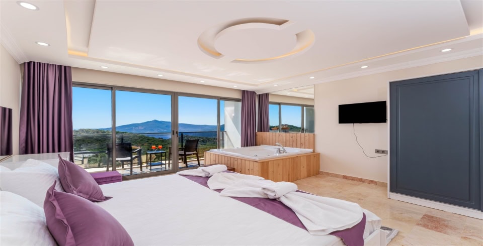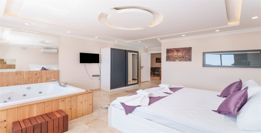 2. Yatak Odası : Çift kişilik yatak, komodin, klima, balkon, jakuzi, TV, makyaj masası, banyo ve lavabo bulunmaktadır.