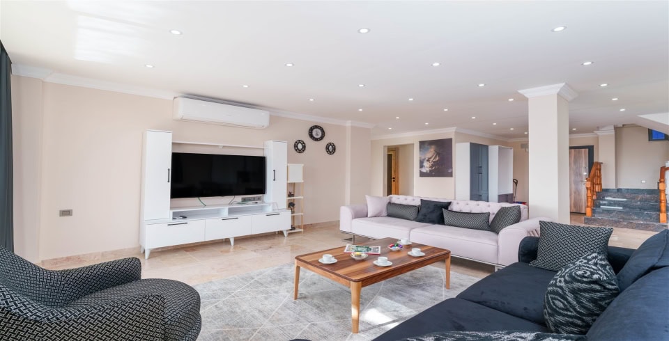Salon : Villamızın iç dizaynı da son modaya uygun olarak modern bir şekilde tasarlanmıştır. Çeşitli dekoratif eşyalarla süslediğimiz salonumuz havuzlu bahçeye açılıyor. Villa salonunda oturma grubu, TV, internet, klima, sehpa bulunmaktadır.