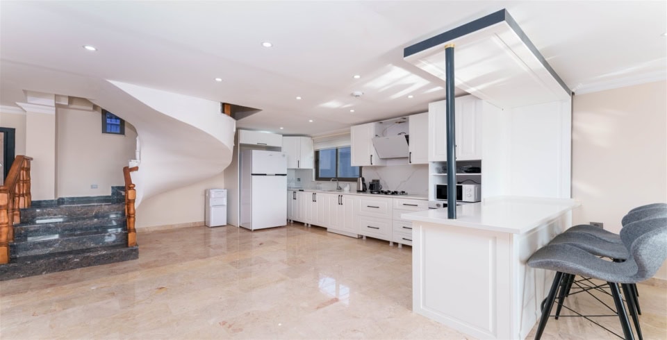 Mutfak : Modern Amerika mutfağımızda yemek masası, buzdolabı, mikrodalga fırın, 4’lü ocak,, elektrikli su ısıtıcısı, çatal-bıçak takımı, tencere-tava takımı bulunmaktadır.