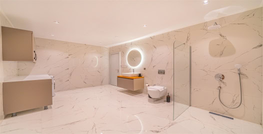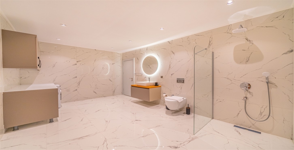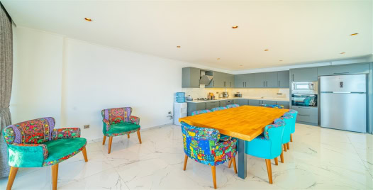 Villanın zemin katında yer alan geniş salon, konforlu oturma grubu, şık aksesuarlar ve büyük cam kapılarıyla aydınlık bir atmosfere sahiptir. Akıllıca tasarlanmış iç mekân, doğrudan havuz terasına açılır. Modern mutfak; bulaşık makinesi, buzdolabı, mikrodalga, fırın, ocak ve tüm mutfak gereçleriyle eksiksiz donatılmıştır. Ayrıca yemek masası ve kahvaltı alanı, misafirlere keyifli sofralar sunar.