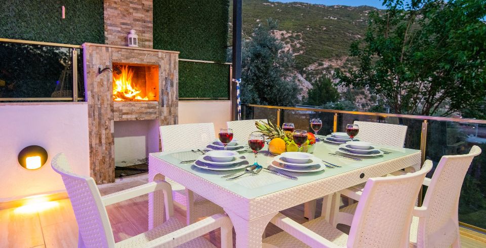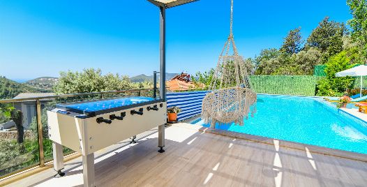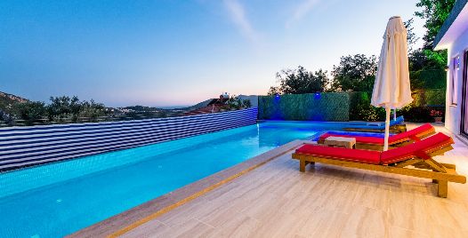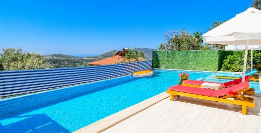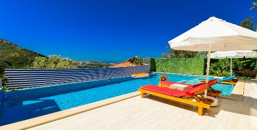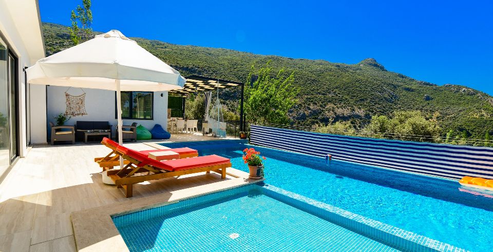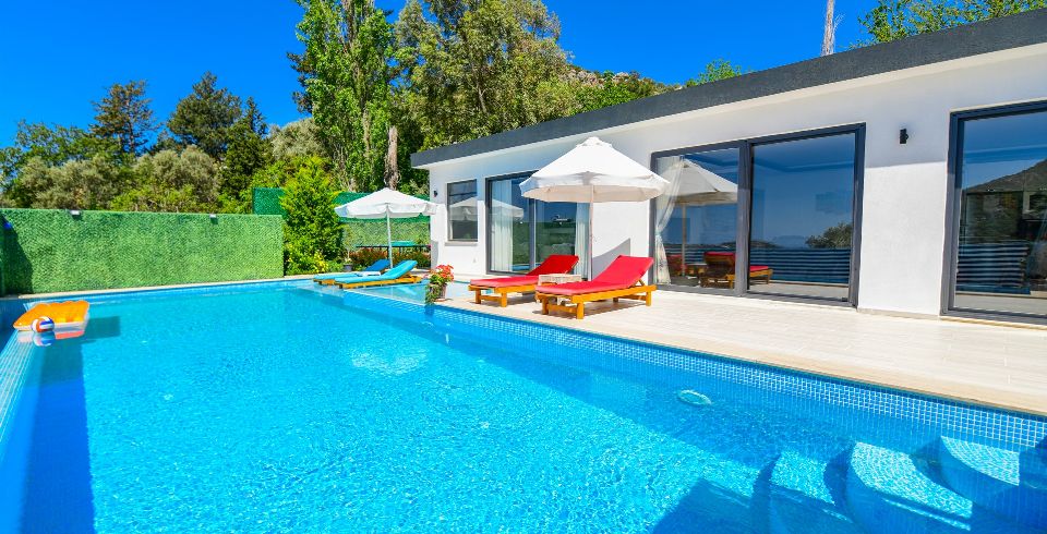Havuz : Havuz terası korunaklı olup dış taraftan gözükmemektedir. Villamızın havuz terasında şezlong, şemsiye, mangal ve oturma grubu bulunmaktadır.