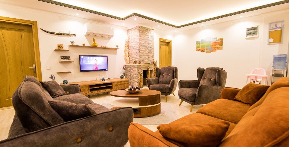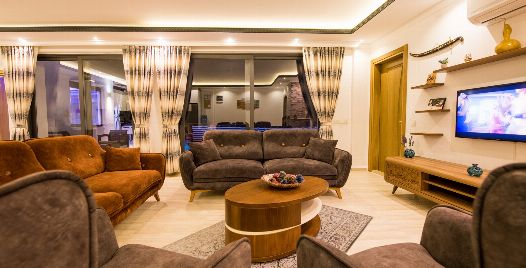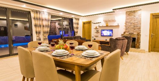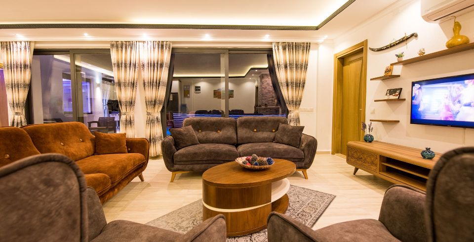 Salon : Salonumuzda oturma grubu, LCD TV, klima, sehpa bulunmaktadır. Havuz terasına çıkış yapılabilmektedir.
