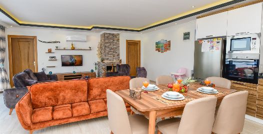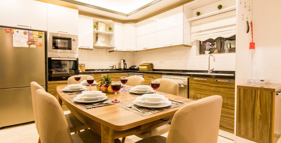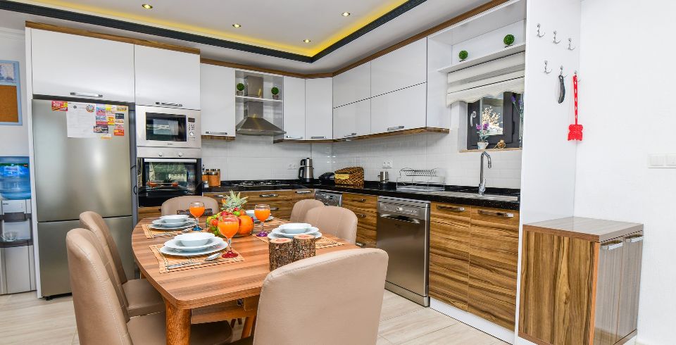 Mutfak : Modern Amerikan mutfakta buz dolabı, bulaşık makinası, 4'lü ocak, fırın, mikrodalga fırın, ekmek kızartma makinası,kettle,4 kişilik yemek masası, yemek takımları, çatal ve bıçak takımları, tencere ve tava takımları, bardaklar bulunmaktadır.