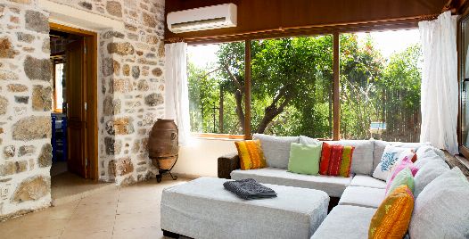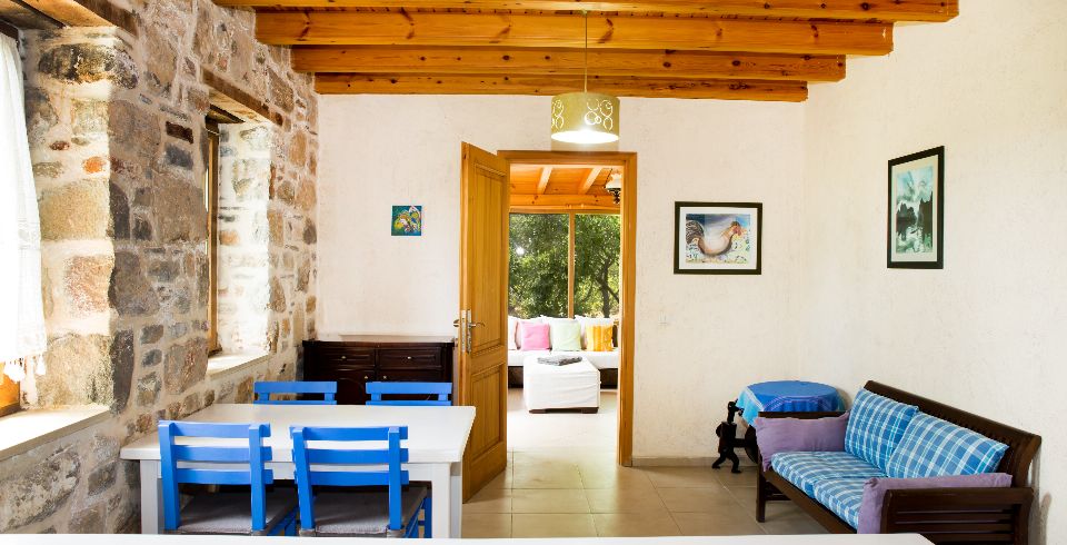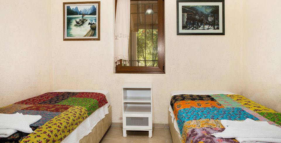 Toplam 2 yatak odası ve 4 kişilik konaklama kapasitesi ile küçük aileler ve balayı çiftleri için ideal bir seçenektir. Ana yatak odasında çift kişilik yatak, klima ve özel banyo bulunurken; ikinci yatak odasında iki tek kişilik yatak yer alır. Geniş ve aydınlık salon, doğrudan terasa açılan kapılarıyla bahçeyle bütünleşmiş bir yaşam alanı sunar. Salonda klima, oturma grubu, televizyon, müzik sistemi ve şömine bulunmaktadır.
