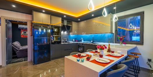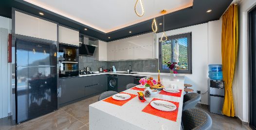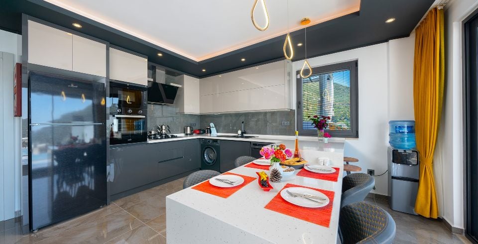 Mutfak : Amerikan mutfak içerisinde buzdolabı, bulaşık makinası, çamaşır makinası, yemek masası, mikrodalga fırın, 4’lü ocak, davlumbaz, fırın, elektrikli su ısıtıcı, yemek takımı, tava ve tencereler, çatal, bıçak takımı bulunmaktadır.