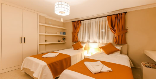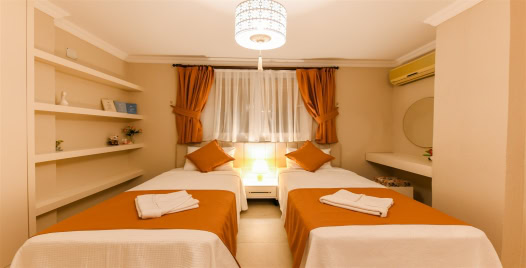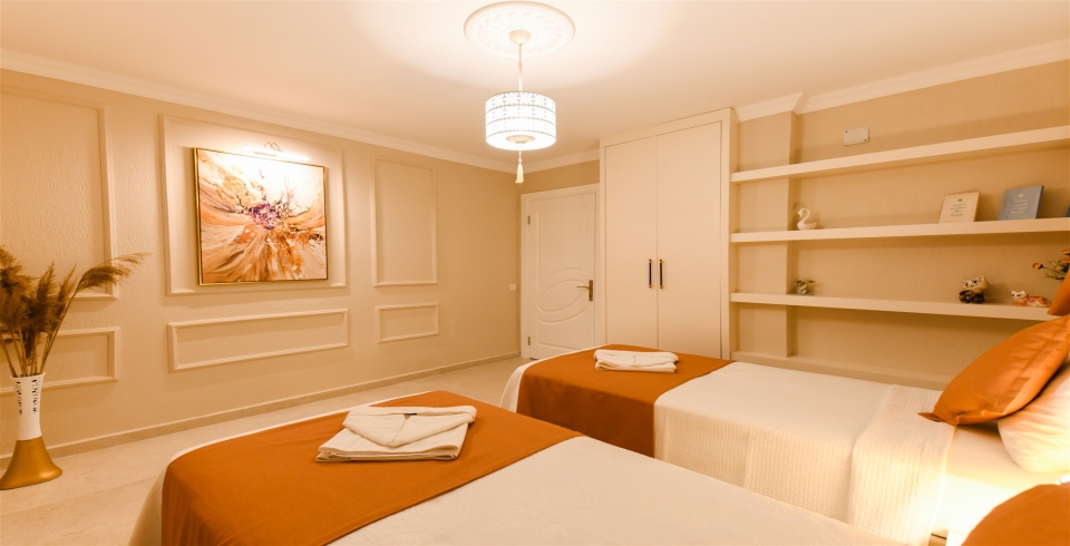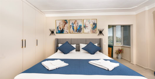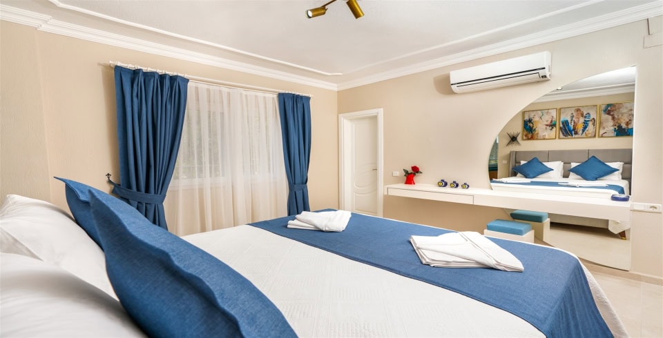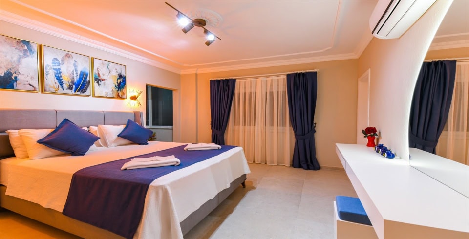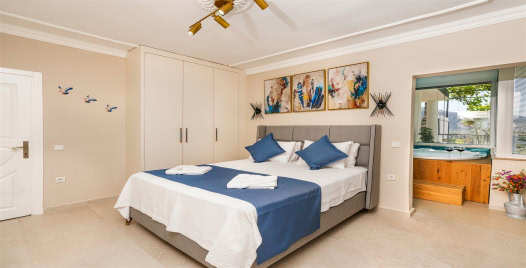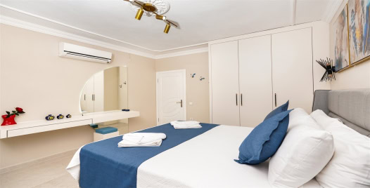 Yatak Odası : 1 adet çift kişilik yatak, klima,jakuzi, elbise dolabı, makyaj masası, komodin, banyo ve lavabo bulunmaktadır.