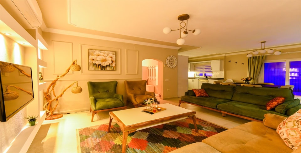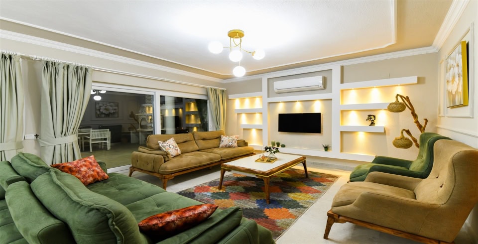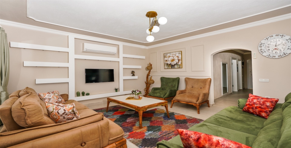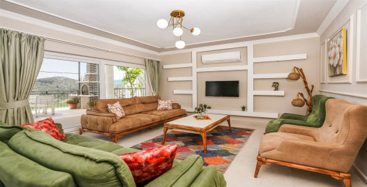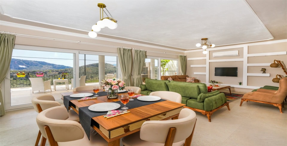 Salon : Havuz terasına direkt çıkışı olan salonumuzda televizyon, modem, oturma grubu, klima, sehpa bulunmaktadır.