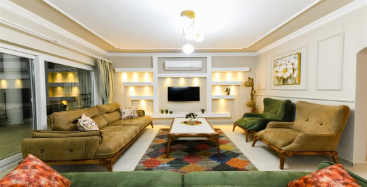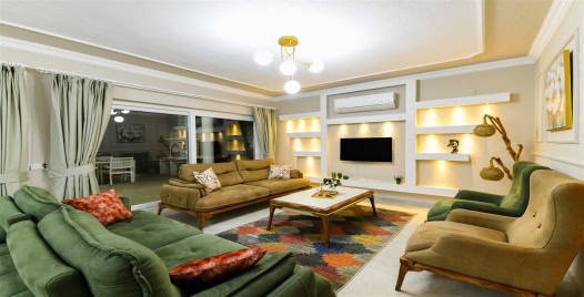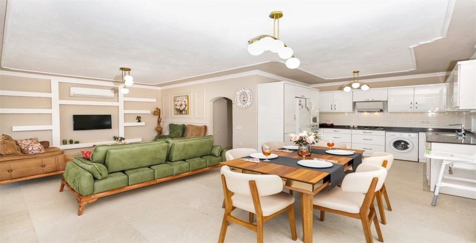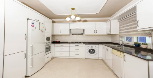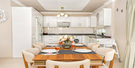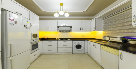 Mutfak : Buzdolabı, bulaşık makinası, çamaşır makinası, kettle, kahve makinası, fırın, mikrodalga fırın, ocak, yemek masası, yemek takımları, tencere tava takımları, çaydanlık bulunmaktadır.