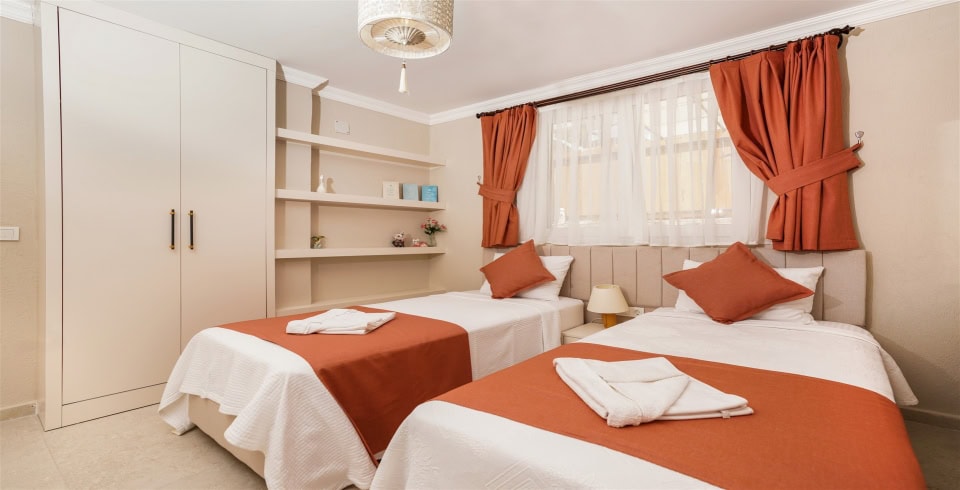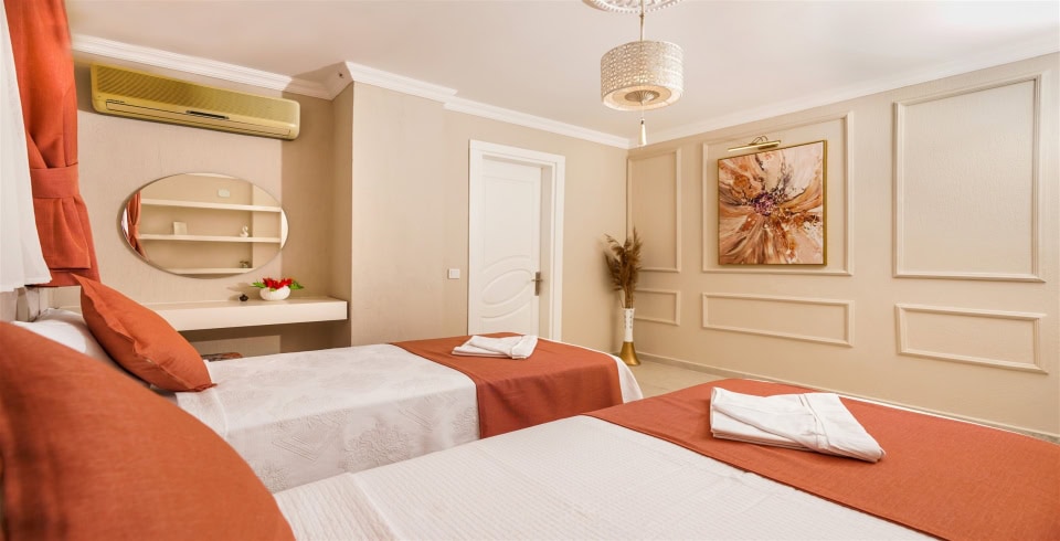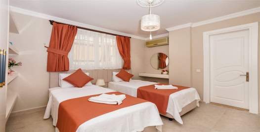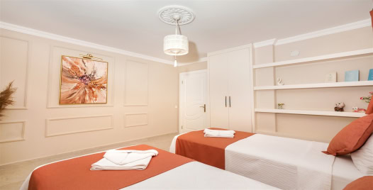 Yatak Odası 2 :1 adet çift kişilik yatak, klima, elbise dolabı, makyaj masası, komodin, banyo ve lavabo bulunmaktadır.