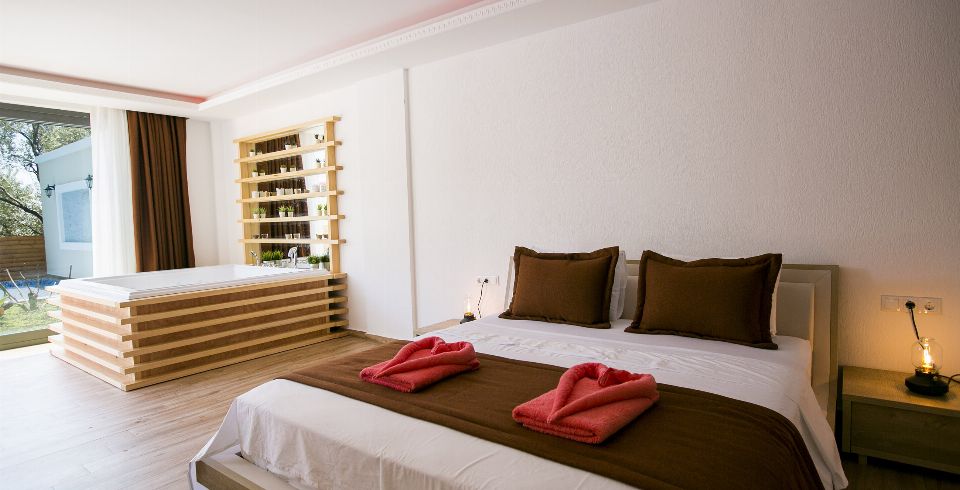 1. Yatak Odası: Çift kişilik yatak, klima, komodin, elbise dolabı, makyaj masası, berjer, jakuzi, banyo ve tuvalet bulunmaktadır.