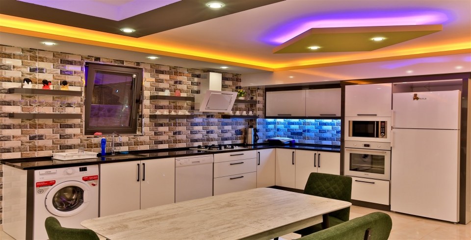 Mutfak : Modern Amerikan mutfak içerisinde 6 kişilik yemek masası ,mama sandalyesi , buzdolabı, bulaşık makinası, fırın, ocak, mikrodalga fırın, tost makinası, yemek masası, yemek takımları, çatal ve bıçak takımları, tencere ve tava takımları, bardaklar bulunmaktadır.