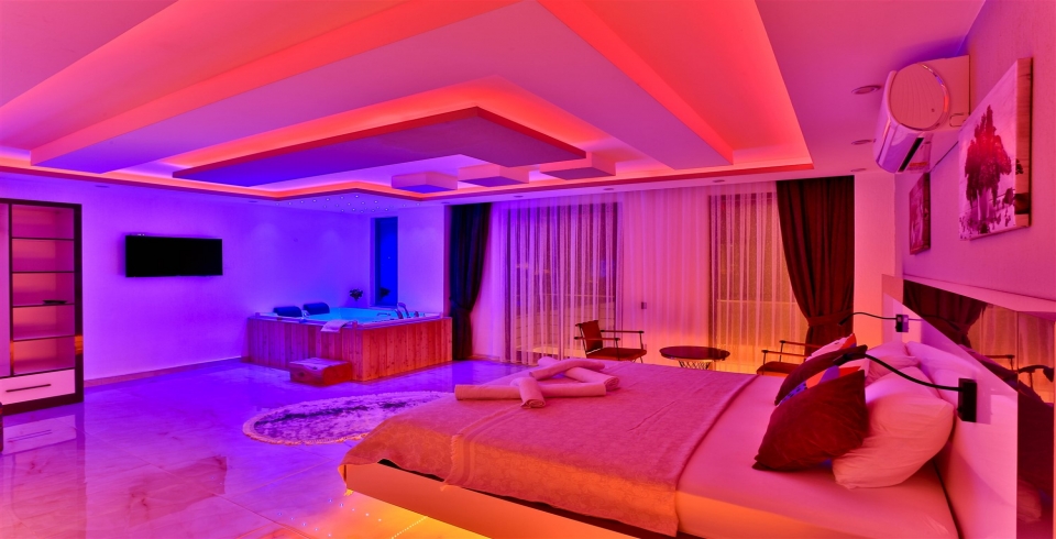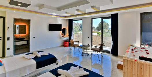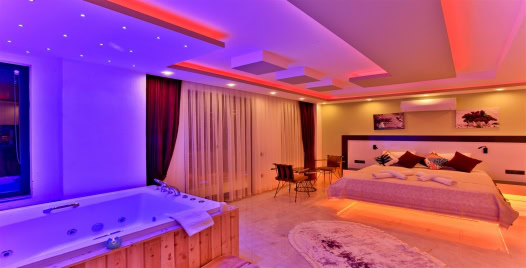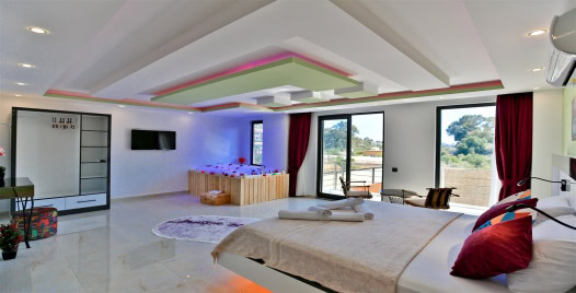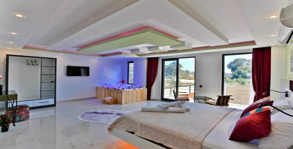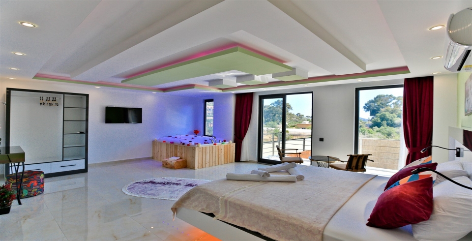 1. Yatak Odası : 1 adet çift kişilik yatak, klima, komodin, elbise dolabı, makyaj masası, TV, jakuzi, banyo ve tuvalet bulunmaktadır.