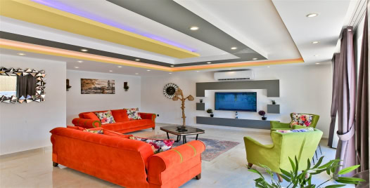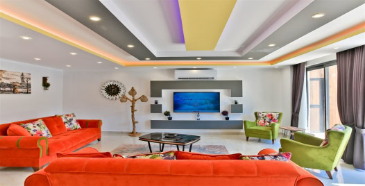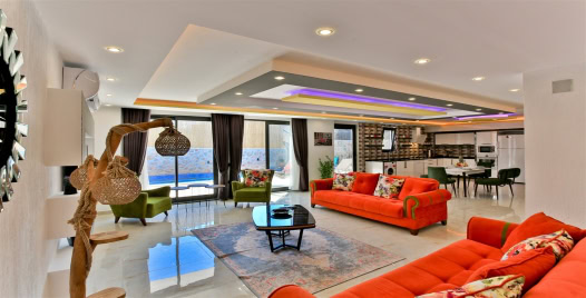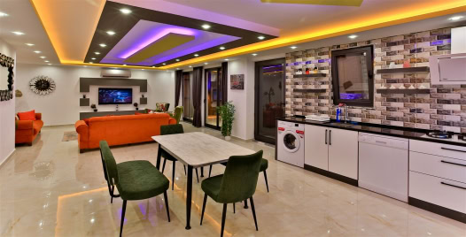 Salon : Salon içerisinde oturma grubu, TV, klima, sehpa bulunmaktadır. Havuz terasına çıkış yapılabilmektedir.