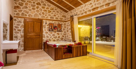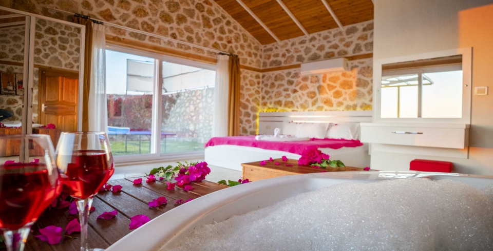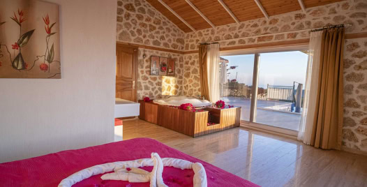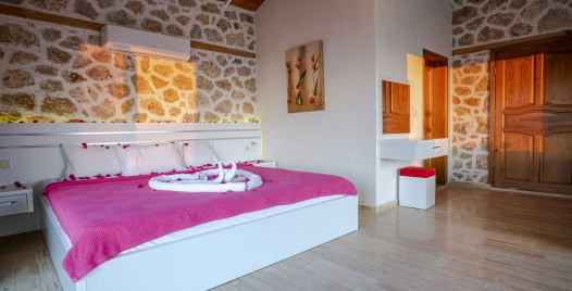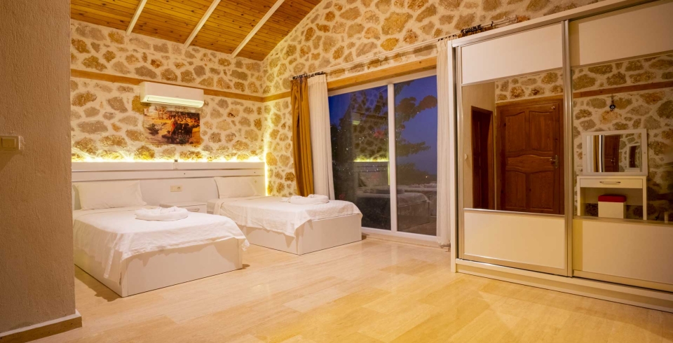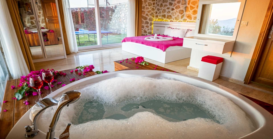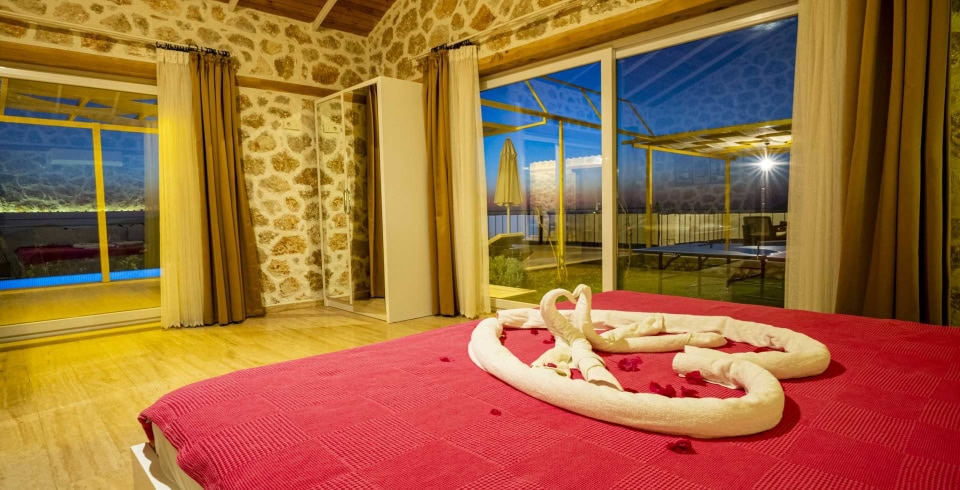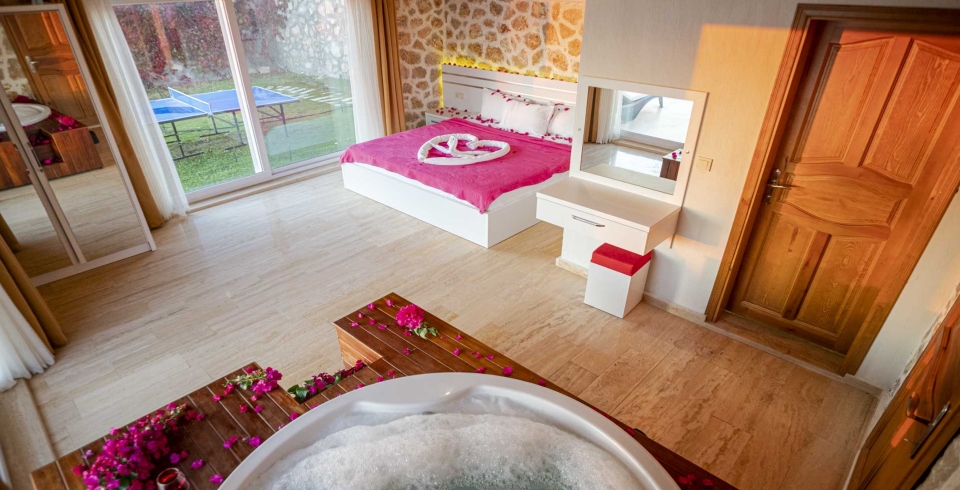 1. Yatak Odası: Çift kişilik yatak, klima, jakuzi, komodin, elbise dolabı, makyaj masası, banyo ve tuvalet bulunmaktadır.