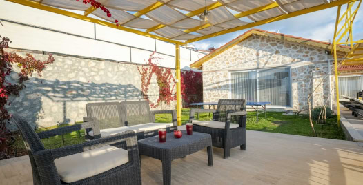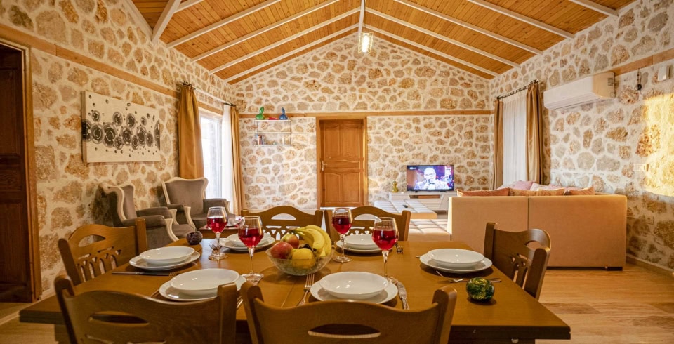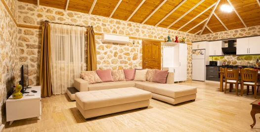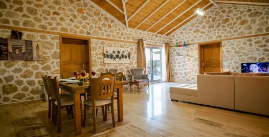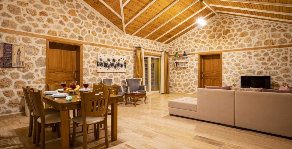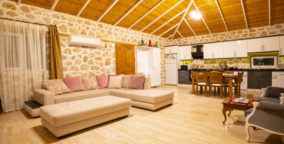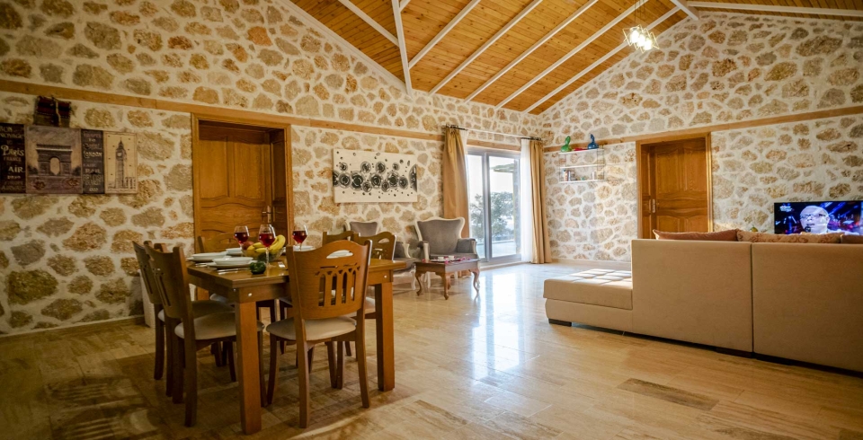 Salon: Villa salonunda konforlu oturma grubu, klima, TV, internet, uydu alıcı, yemek masası, sehpa bulunmaktadır.