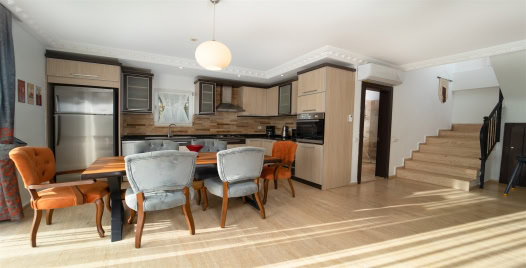 Mutfak : Modern Amerikan mutfakta buzdolabı, bulaşık makinası, fırın, 4'lü ocak, mikrodalga fırın, kettle, tost makinası, 4 kişilik yemek masası, yemek takımları, çatal ve bıçak takımları, tencere ve tava takımları, bardaklar bulunmaktadır