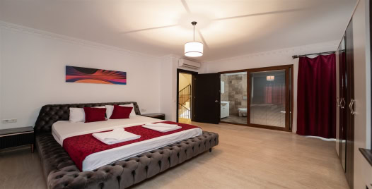 1. Yatak Odası : Çift kişilik yatak, klima, banyo, elbise dolabı, makyaj masası, komodin bulunmaktadır. Deniz manzaralı yatak odası.
