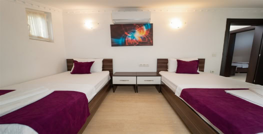 3. Yatak Odası : 2 Adet tek kişilik yatak(birleşebilir), Elbise dolabı, Komodin, Klima, ortak kullanım banyo. Deniz manzaralı yatak odası.