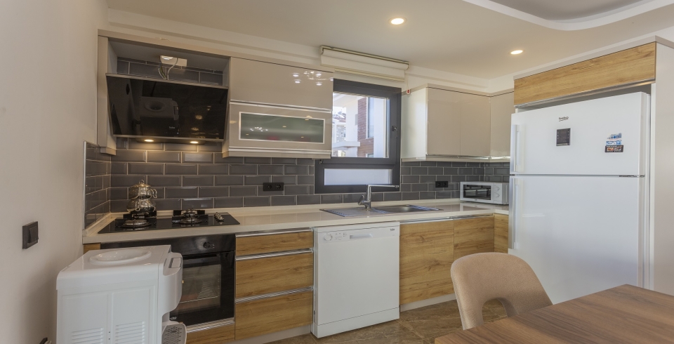 Mutfak: Açık planlı mutfak, 8 kişi ve daha fazla kişiye yetecek kadar mutfak malzemeleri, buzdolabı, fırın, ocak, mikrodalga fırın, bulaşık makinesi, çamaşır makinesi, tost makinesi, kettle ve çaydanlık bulunmaktadır..