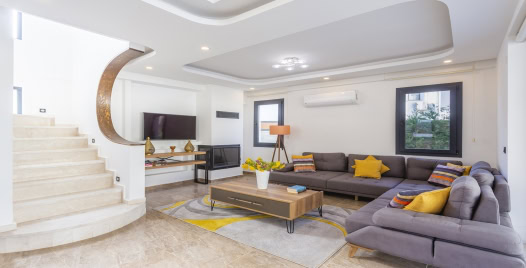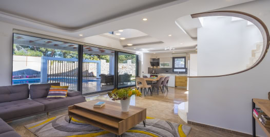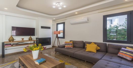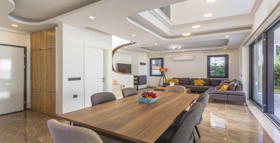 Salon: Özenle döşenmiş salon, modern koltuklar, yemek masası, LCD TV ve klima bulunmaktadır.