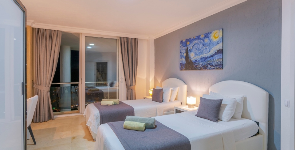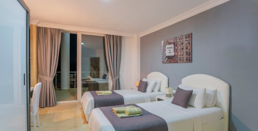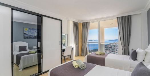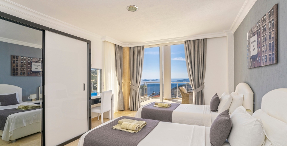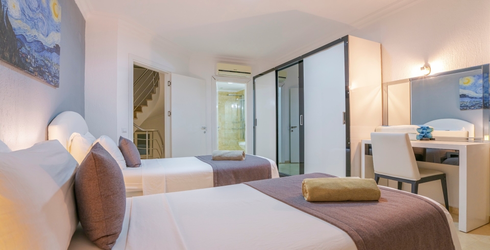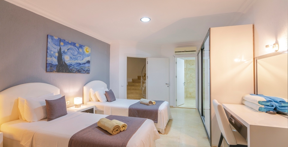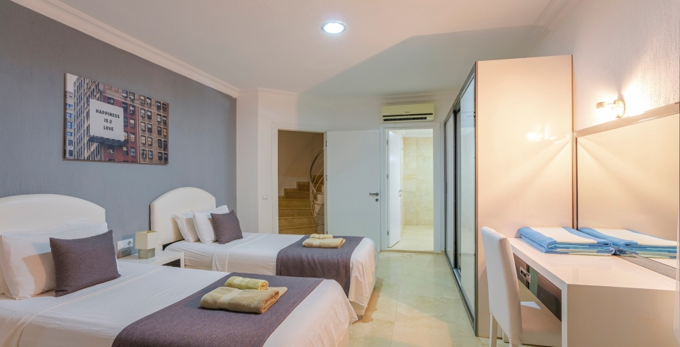4. Yatak Odası: 2 adet tek kişilik yatak, klima, makyaj masası, elbise dolabı, komodin, banyo ve lavabo bulunmaktadır.