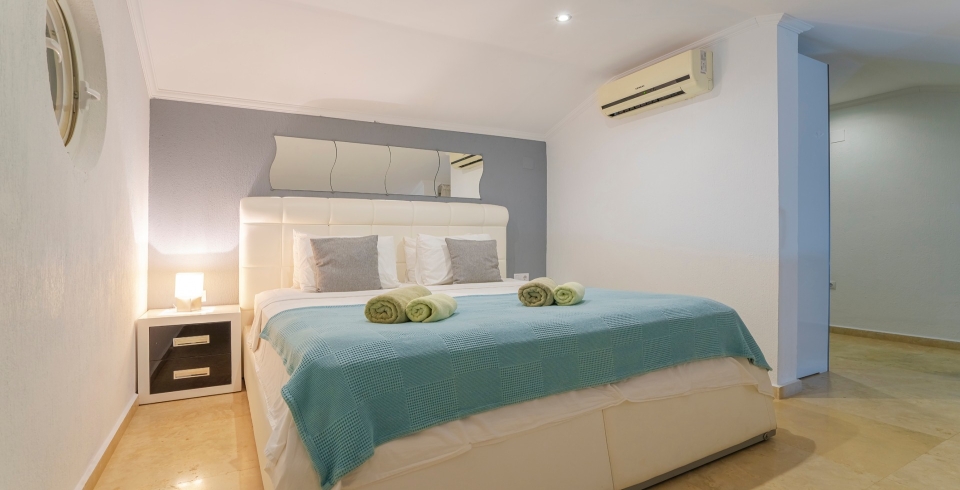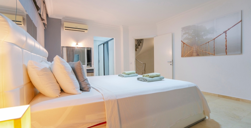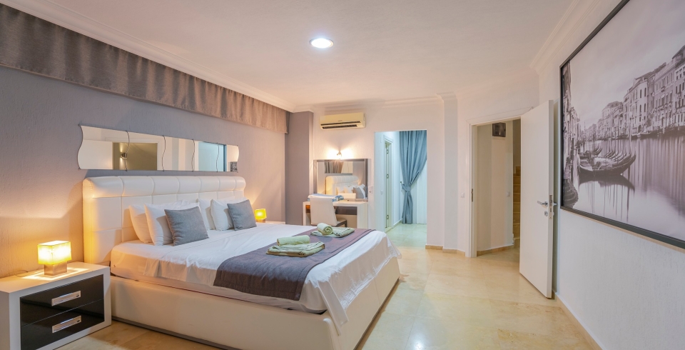 5. Yatak Odası: Çift kişilik süit yatak odası, klima, makyaj masası, elbise dolabı, komodin, banyo ve lavabo bulunmaktadır.