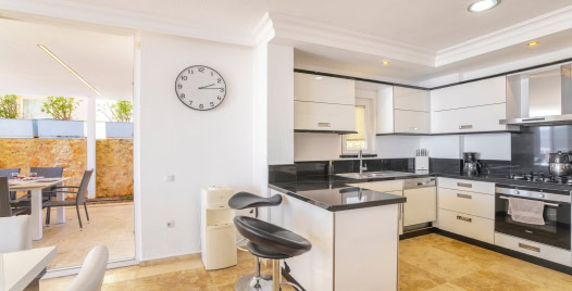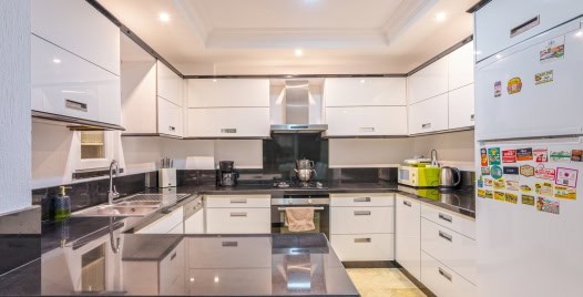 Mutfak: Modern Amerikan mutfakta buzdolabı, bulaşık makinası, fırın, ocak, mikrodalga fırın, ekmek kızartma makinası, su sebili, kettle, yemek masası, yemek takımları, çatal ve bıçak takımları, tencere ve tava takımları, bardaklar bulunmaktadır.