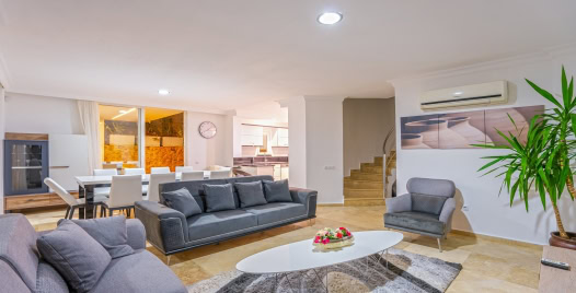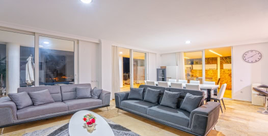 Salon: Salon içerisinde oturma grubu, TV uydu, klima, sehpa bulunmaktadır. Salonumuzdan havuz terasına çıkış yapılabilmektedir.
