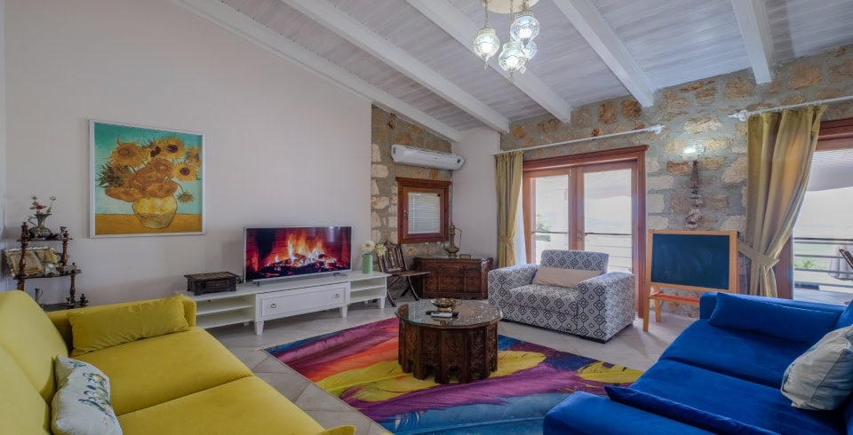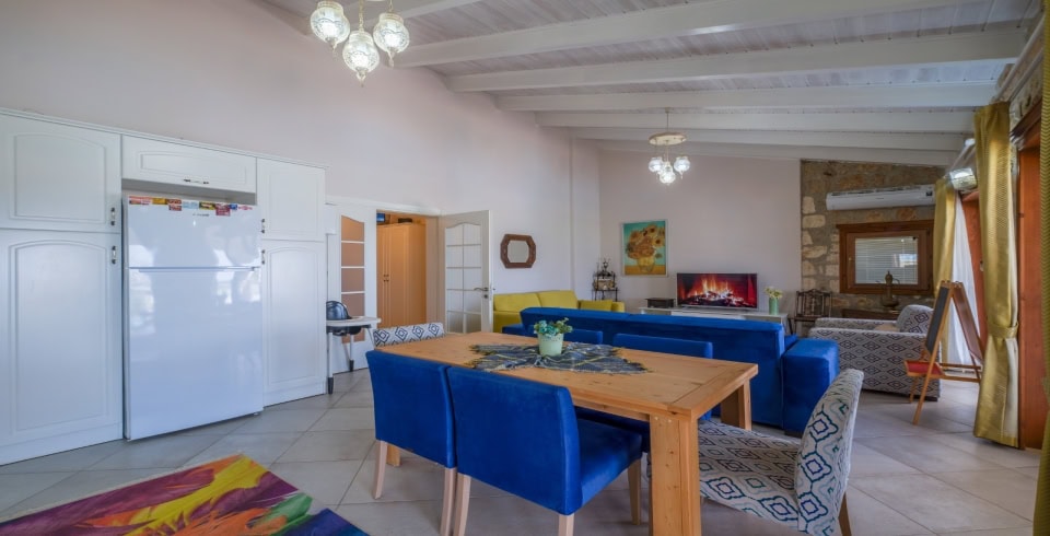 Salon :Oturma grubu, klima, sehpa, TV, uydu alıcı, kablosuz modem, havuz terasına çıkış bulunmaktadır.