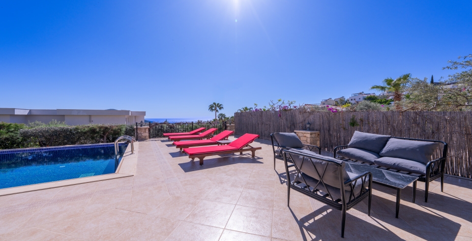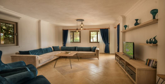 Salon: Deniz ve Doğa Manzarası, Oturma Grubu, Uydu TV (LCD), Kablosuz İnternet, Klima, 6 Kişilik Yemek Masası, Havuz Terasına Çıkış, WC&Lavabo