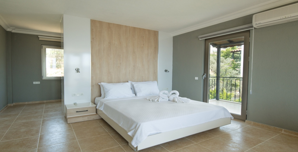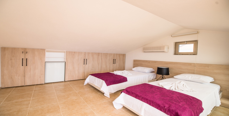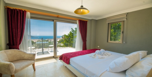 3. Yatak odası : Deniz manzaralı odada çift kişilik yatak, elbise dolabı, makyaj masası, komodin, klima, banyo ve balkon bulunmaktadır.