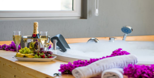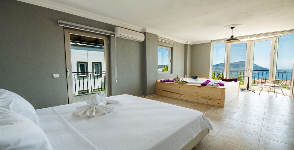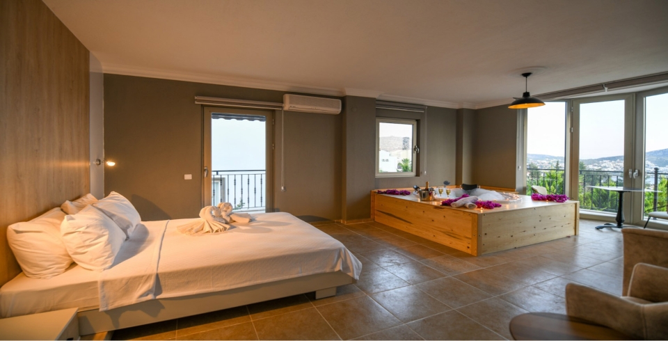 1. Yatak odası : Deniz manzaralı odada çift kişilik yatak, elbise dolabı, makyaj masası, komodin, klima, banyo, jakuzi ve balkon bulunmaktadır.