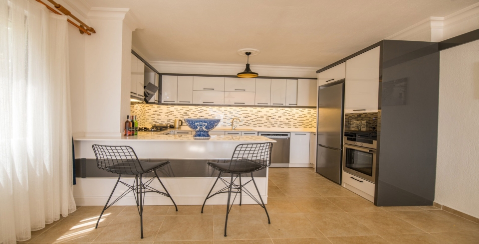 Mutfak: Geniş, Ferah ve Modern Dizayn Edilmiş Amerikan Mutfak, Buzdolabı, Bulaşık Makinesi, Çamaşır Makinesi, Fırın, 4’lü Ocak (ankastre), Mikrodalga Fırın, Elektrikli Su Isıtıcı, Tava & Tencere vb. Mutfak Ekipmanları, 8 Kişilik Yemek Takımı
