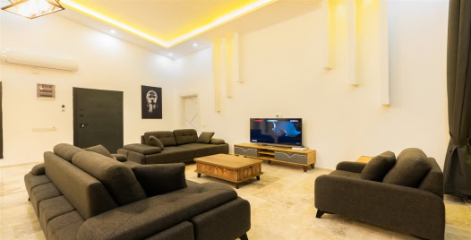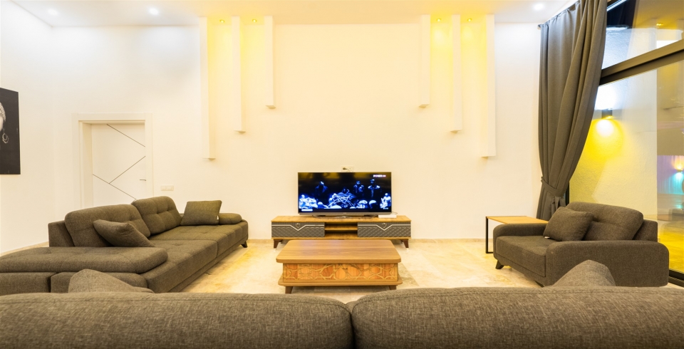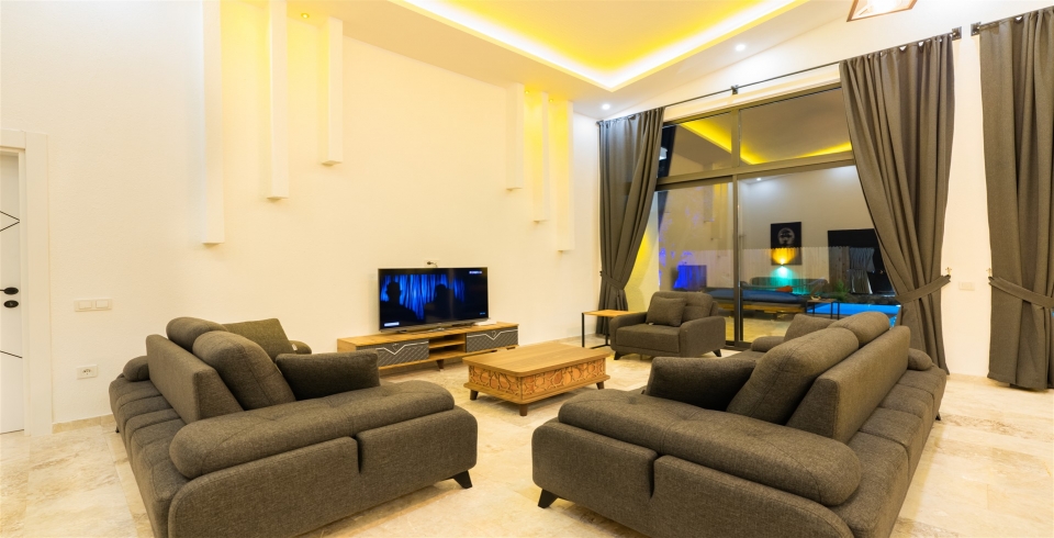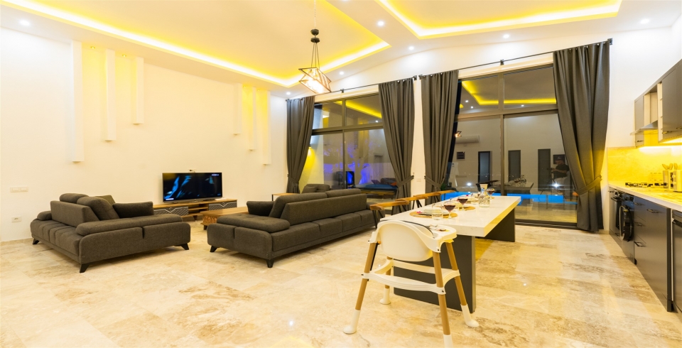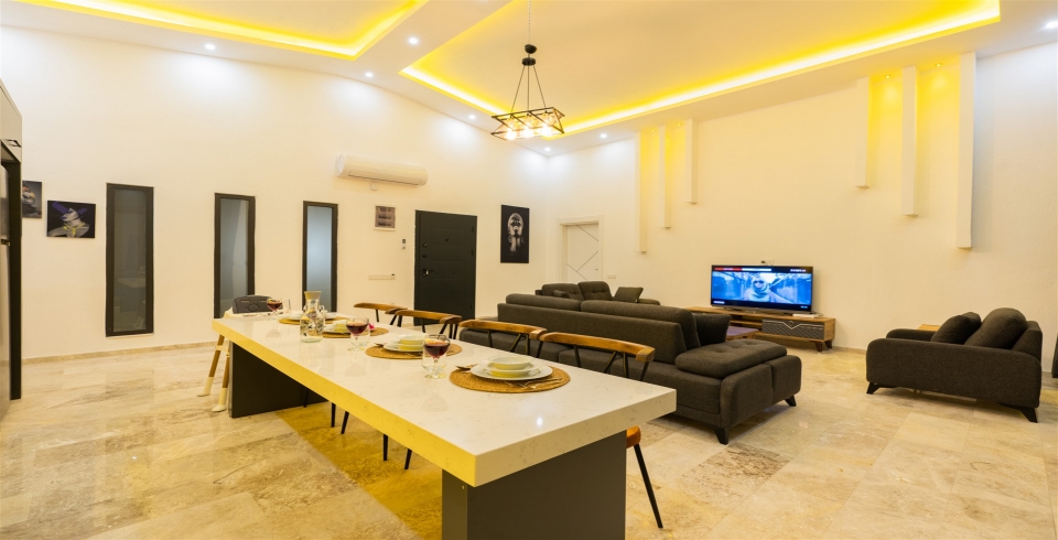 Salon: Villa salonunda oturma grubu, klima, TV, internet, uydu alıcı, yemek masası, sehpa bulunmaktadır.