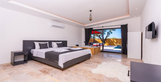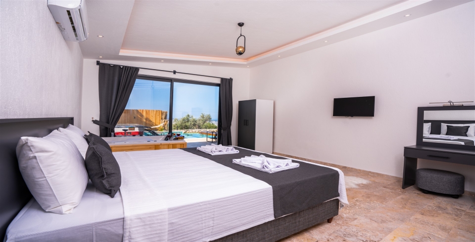 1.Yatak Odası: 1 çift kişilik yatak, komodin, klima, makyaj masası, TV, elbise dolabı, jakuzi, banyo ve lavabo bulunmaktadır.