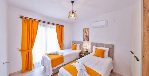 1. Yatak Odası : 2 Adet tek kişilik yatak, Komodin, Klima, Elbise dolabı ve Banyo (ortak) bulunmaktadır.