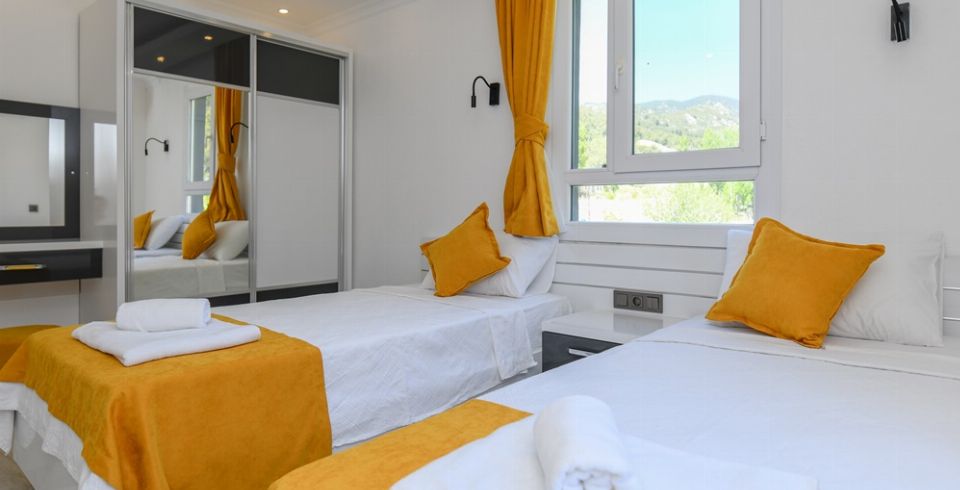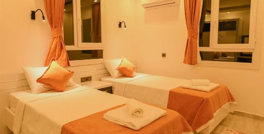 2. Yatak Odası : 2 adet tek kişilik yatak, klima, elbise dolabı, makyaj masası, komodin, banyo ve lavabo bulunmaktadır.