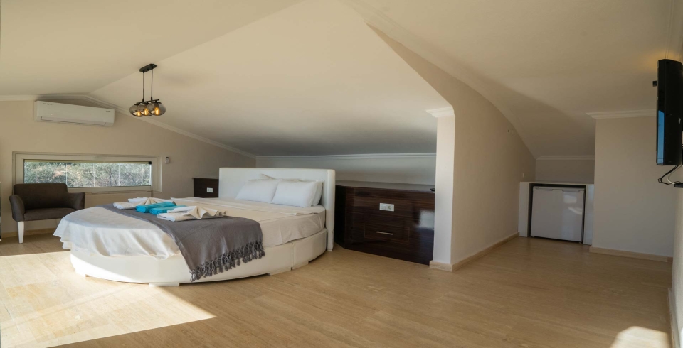 5. Yatak Odası: 1 adet çift kişilik yatak, TV, elbise dolabı, makyaj masası, komodin, teras, jakuzi, klima ve banyo-WC bulunmaktadır.