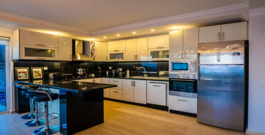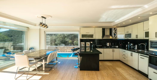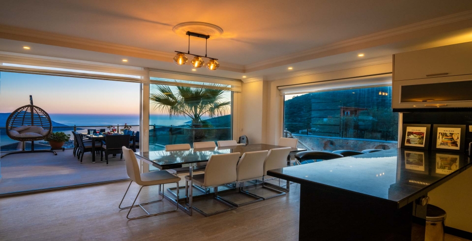 Villa in the Sky, geniş cam yüzeyleri sayesinde Kalkan Körfezi’nin kesintisiz manzarasını iç mekana taşıyor. Salon kısmında konforlu oturma alanları, büyük ekran TV, dijital platformlar ve şık dekorasyon detayları yer alıyor. Açık planlı modern mutfak; ankastre fırın, mikrodalga, geniş buzdolabı, kahve makinesi ve benzeri yüksek standartlı ekipmanlarla eksiksiz donatılmıştır. Uzun süreli konaklamalarda bile ev sıcaklığında ve konforunda zaman geçirebilirsiniz.