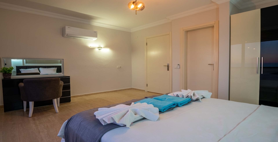 1. Yatak Odası: 1 adet çift kişilik yatak, TV, elbise dolabı, makyaj masası, komodin, klima ve banyo-WC bulunmaktadır.
