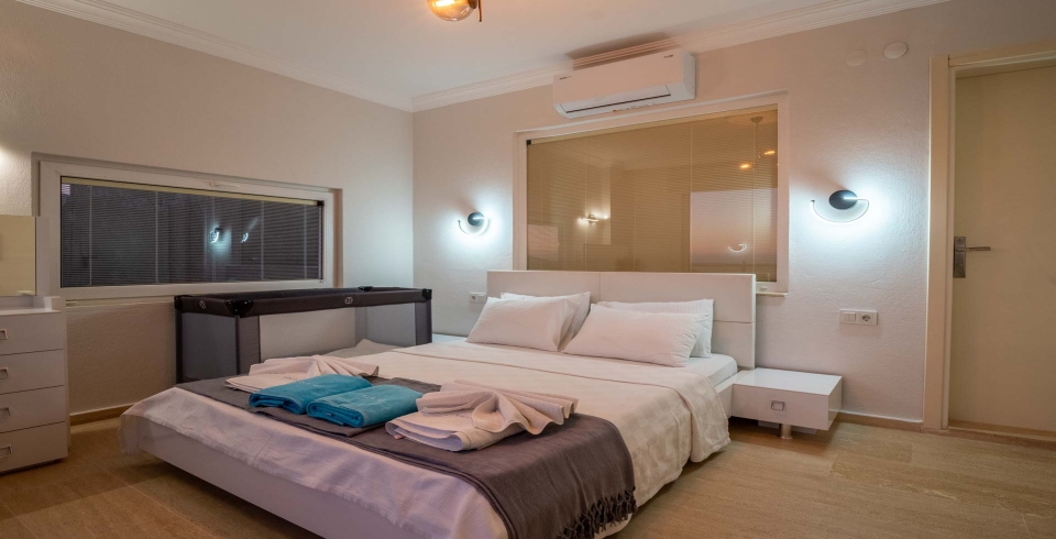 Toplam beş yatak odasının tamamı ebeveyn banyoludur ve her biri misafirlere özel alan sunar. Üst katlarda yer alan iki master oda, geniş jakuziler, panoramik pencereler ve balkonlarıyla dikkat çeker. Alt katlarda yer alan odalar ise bahçeye doğrudan erişim sağlarken, modern detaylarla konforu ve mahremiyeti bir arada sunar. Bebek yatağı ve ek yatak talep üzerine hazırlanabilir.