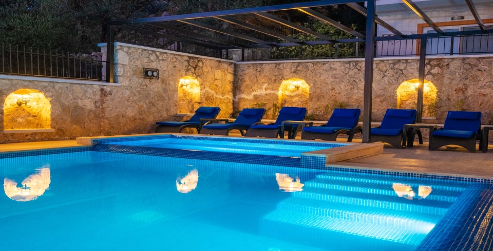 Havuz: Akdeniz mavisiyle buluşan sonsuzluk havuzu konseptiyle dizayn edilmiş havuz önerdiği muhteşem manzaraların yanı sıra genişliğiyle de kalabalık aileleri cezbetmeye aday . (Uzunluk: 14.00m, Genişlik: 4.50m, Derinlik: 1.70m) havuz terasında 8 adet şezlong, pergole vardır.