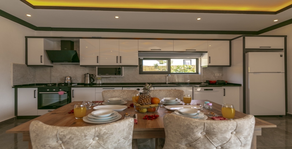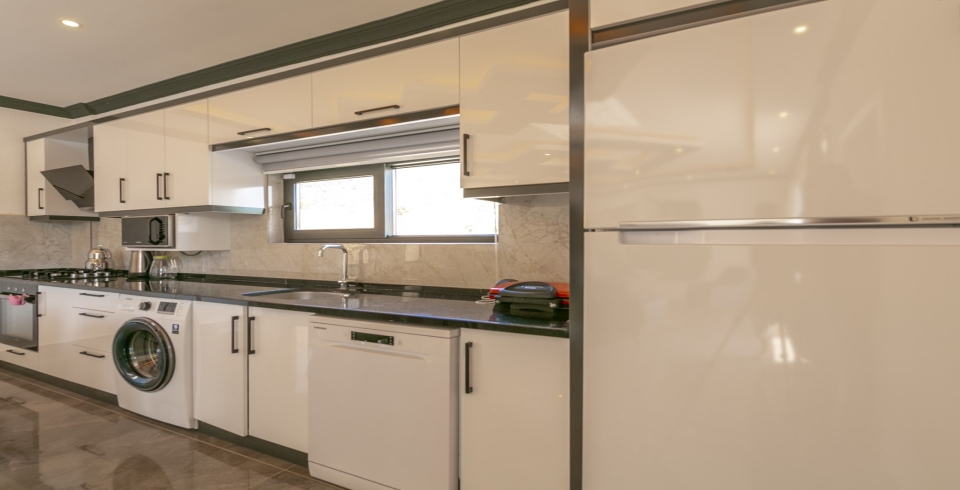 Mutfak : Modern Amerika mutfağımızda 4 kişilik yemek masası, buzdolabı, çamaşır makinesi, mikrodalga fırın, 4’lü ocak, tost makinesi, elektrikli su ısıtıcısı, çatal-bıçak takımı, tencere-tava takımı, bulaşık makinesi bulunmaktadır.
