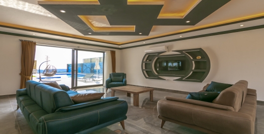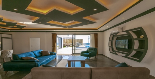 Salon :Villamızın iç dizaynı da son modaya uygun olarak modern bir şekilde tasarlanmıştır. Çeşitli dekoratif eşyalarla süslediğimiz salonumuz havuzlu bahçeye açılıyor. Villa salonunda oturma grubu, TV, internet, klima, sehpa bulunmaktadır.