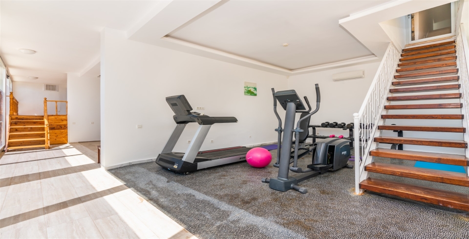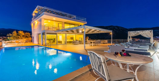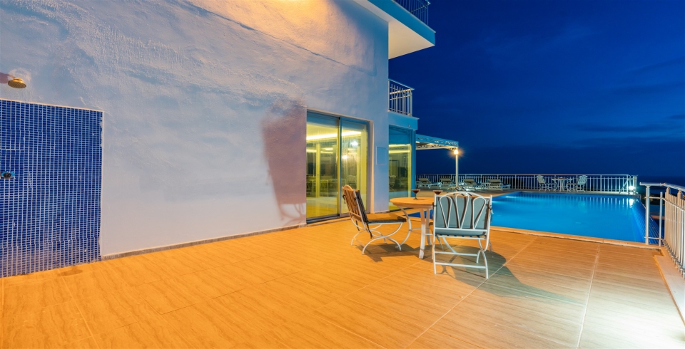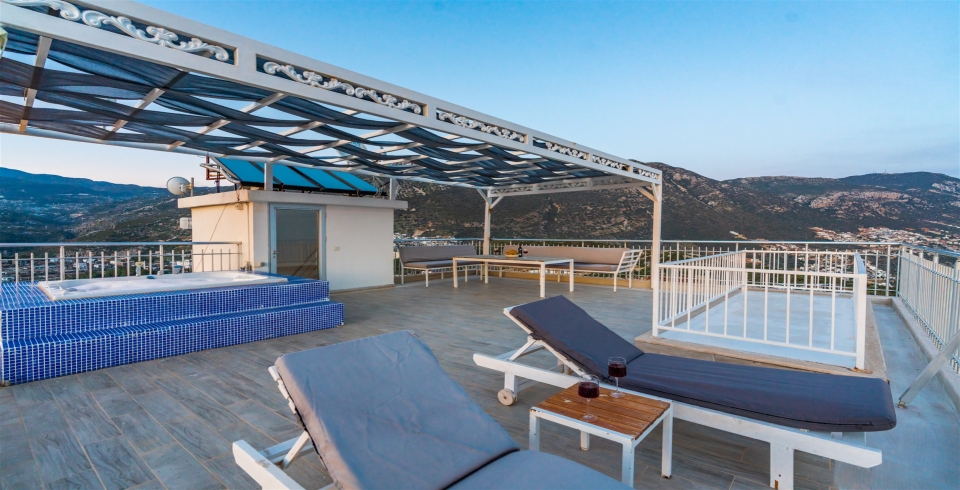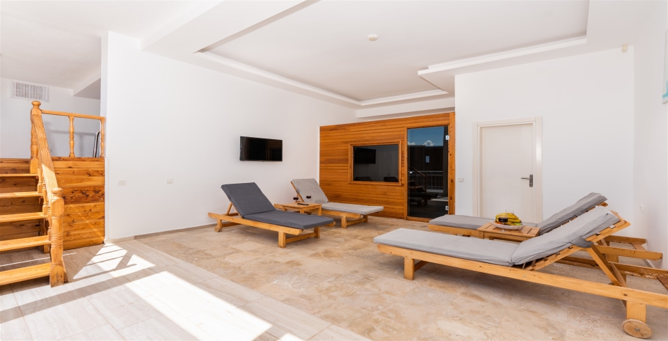 Dış mekanda sonsuzluk hissi veren özel yüzme havuzu, geniş bir güneşlenme alanı ve pergola altında keyifli bir oturma köşesi bulunur. Villa ayrıca sauna, spor alanı, masa tenisi ve ısıtmalı kapalı havuz gibi olanaklarla dört mevsim tatil imkânı sağlar. Çatı terasında yer alan jakuziden Kalkan koyunun gün batımını izlemek ise unutulmaz bir deneyimdir.