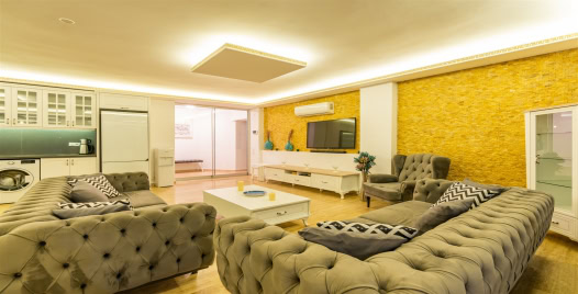 Salon : Salon içerisinde oturma grubu, TV, klima, sehpa bulunmaktadır. Havuz terasına çıkış yapılabilmektedir.
