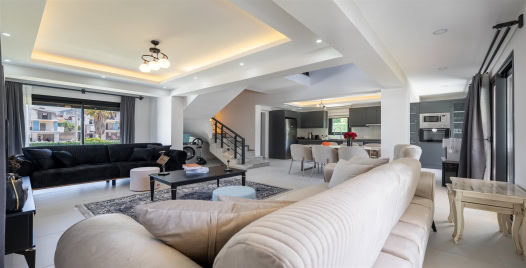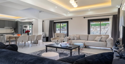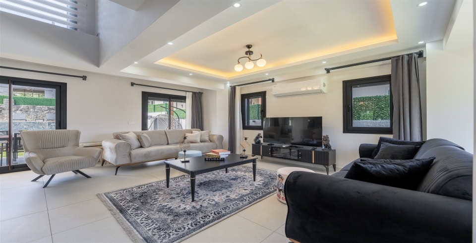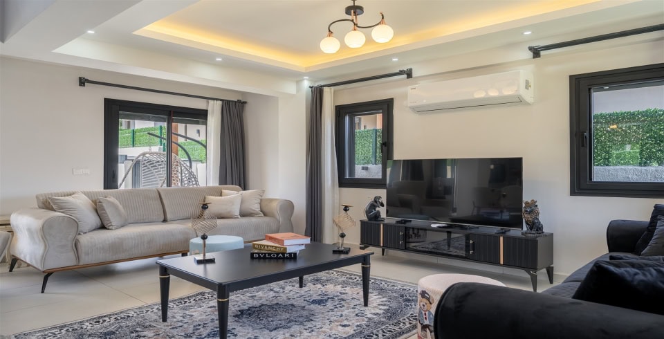 Salon: Özenle döşenmiş salon, modern koltuklar, 8 kişilik yemek masası, LCD TV ve klima bulunmaktadır.