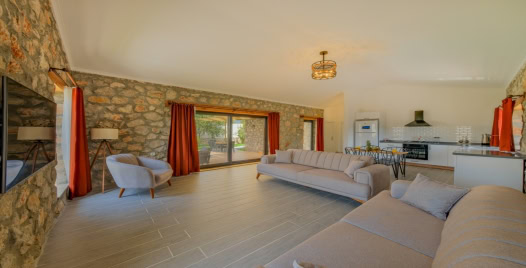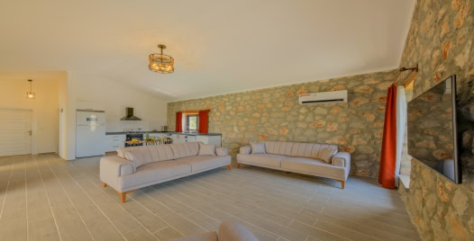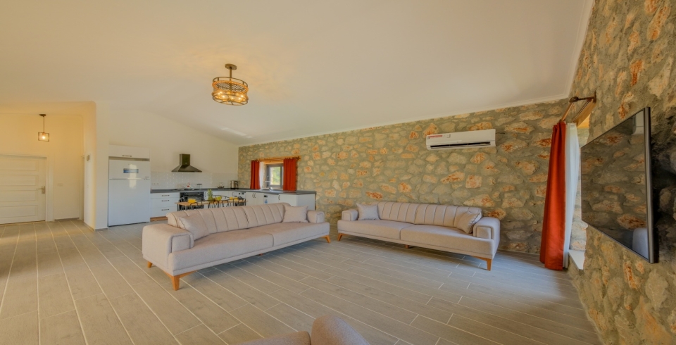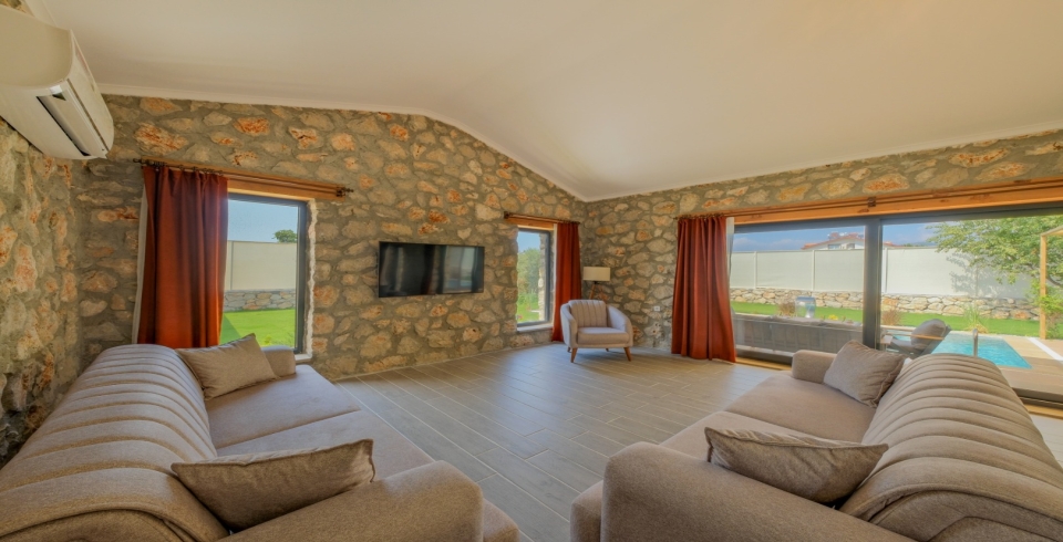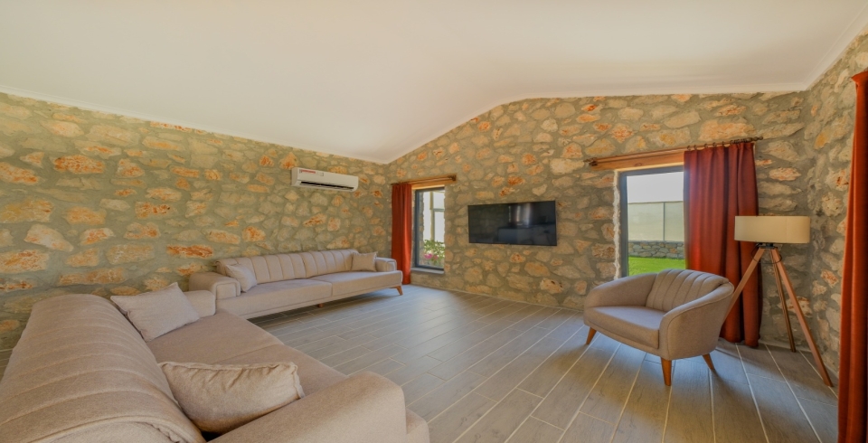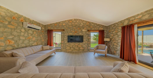 Salon : Sizi şık bir oturma grubu ile klima, televizyon, internet, uydu, koltuk, sehpa ile ferah bir salon bekliyor olacaktır. Havuz terasına çıkış yapılmaktadır.
