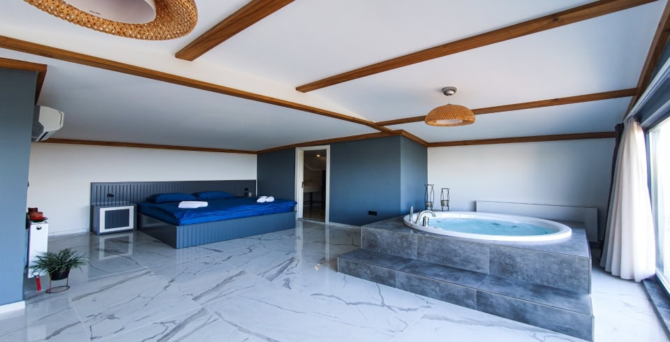 4. Yatak Odası: 1 adet çift kişilik yatak, elbise dolabı, makyaj masası, balkon, banyo, tuvalet ve klima yer almaktadır.