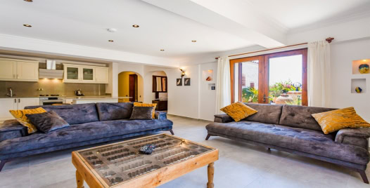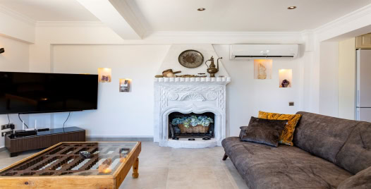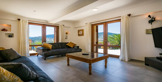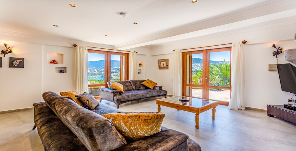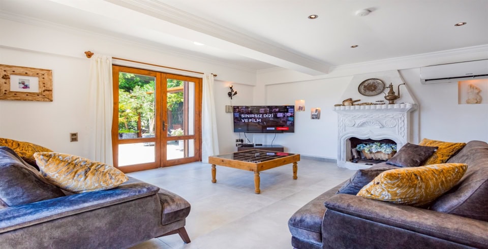 Salon : Salonumuz deniz manzaralı lüks bir salondur. Salonumuzda oturma grubu, uydu TV, DVD Player, klima, 6 kişilik yemek masası, havuz kenarına çıkış, WC & Banyo bulunmaktadır.